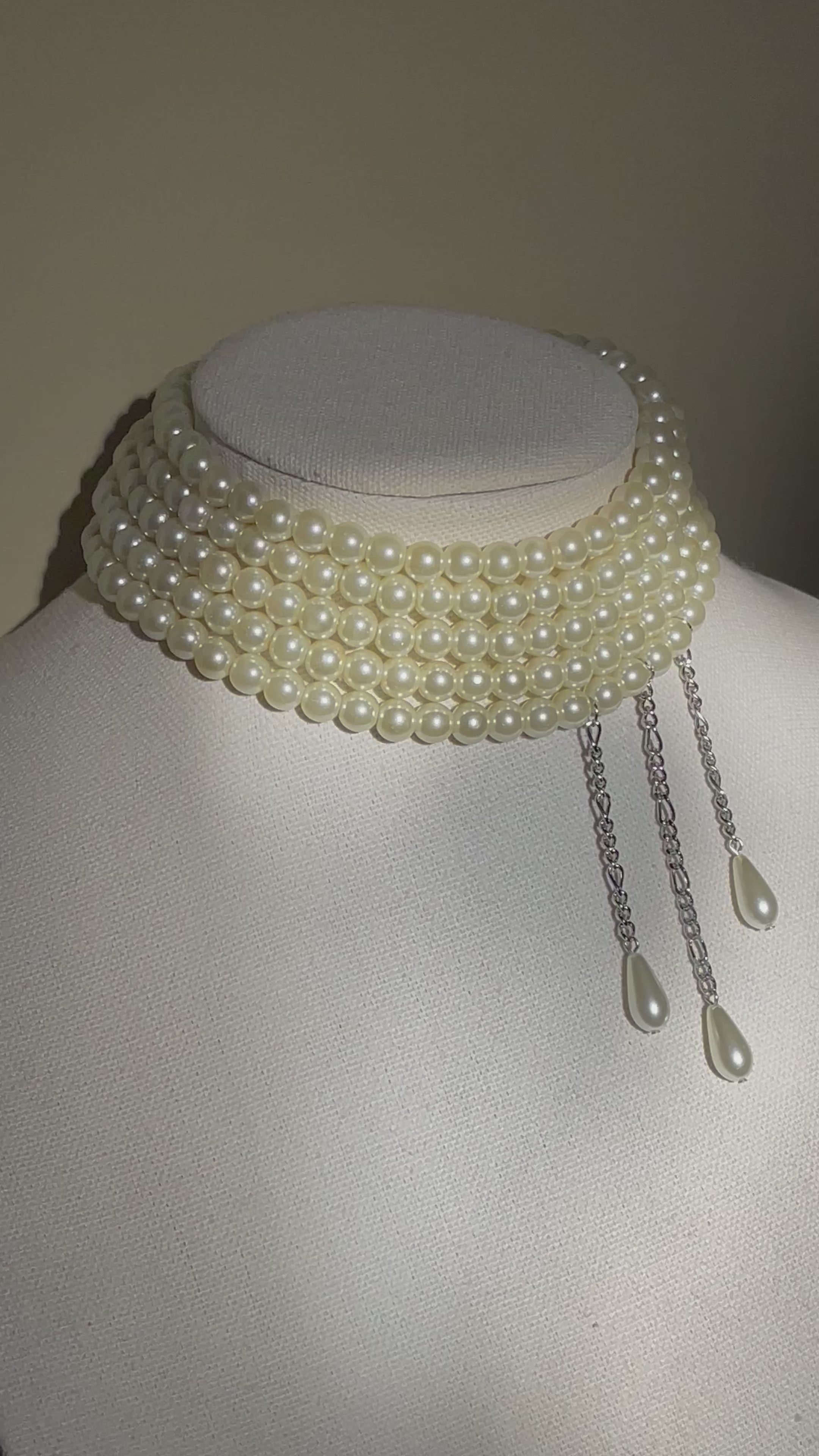 5 Sister Solitaire is a layered choker necklace featuring over 200 premium Cream-Colored Pearls, Cream Teardrops, and Stainless Steel