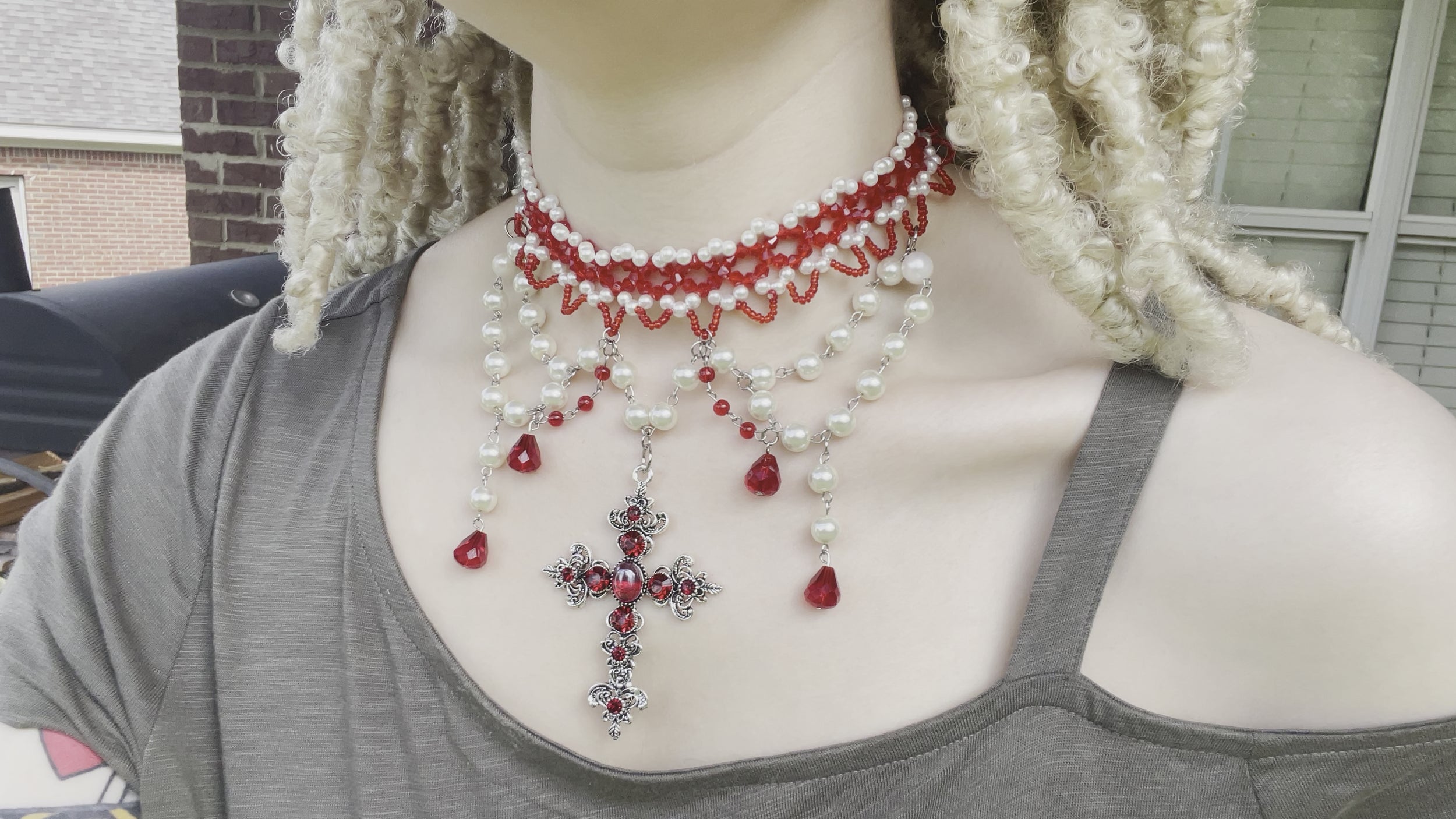 bicone crystals, glass pearls, faceted glass, stainless steel cross pendant, Japanese seed beads, stainless steel hardware and enclosure