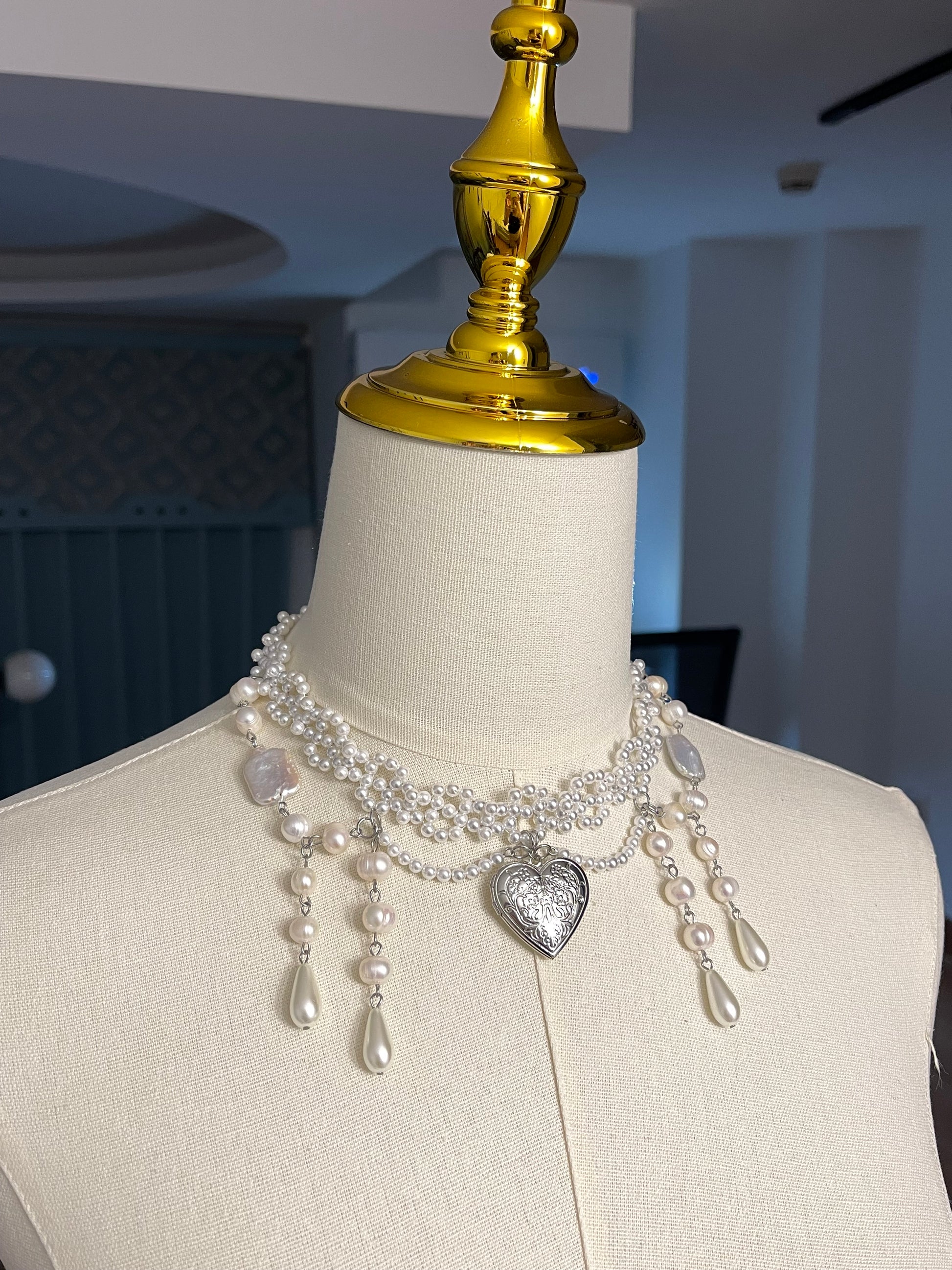 iliyotengenezwa kwa lulu za viazi za maji safi, lulu za glasi, glasi ya taa, ganda asilia, maunzi ya chuma cha pua na uzio, kishaufu chenye bati la fedha.