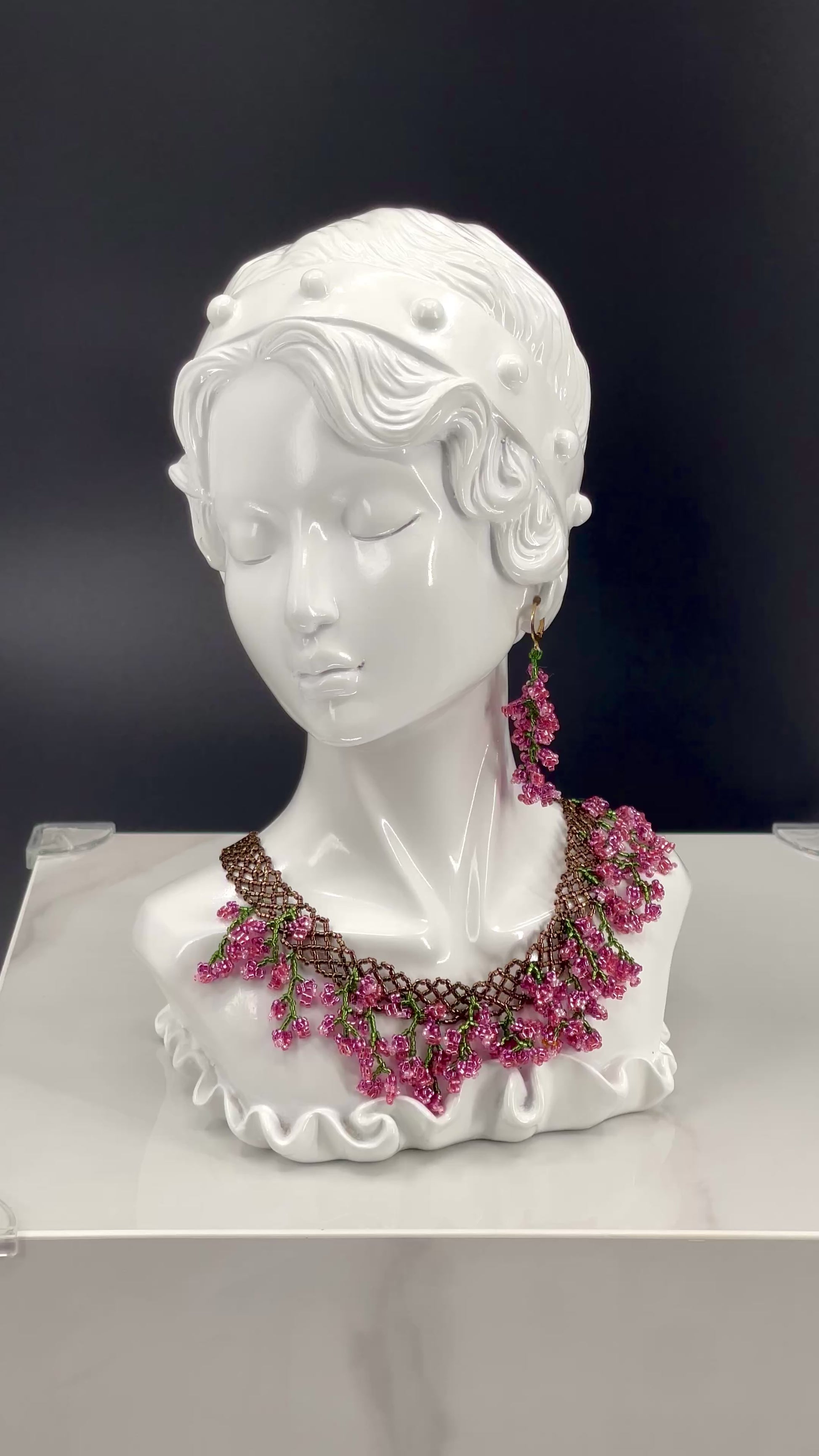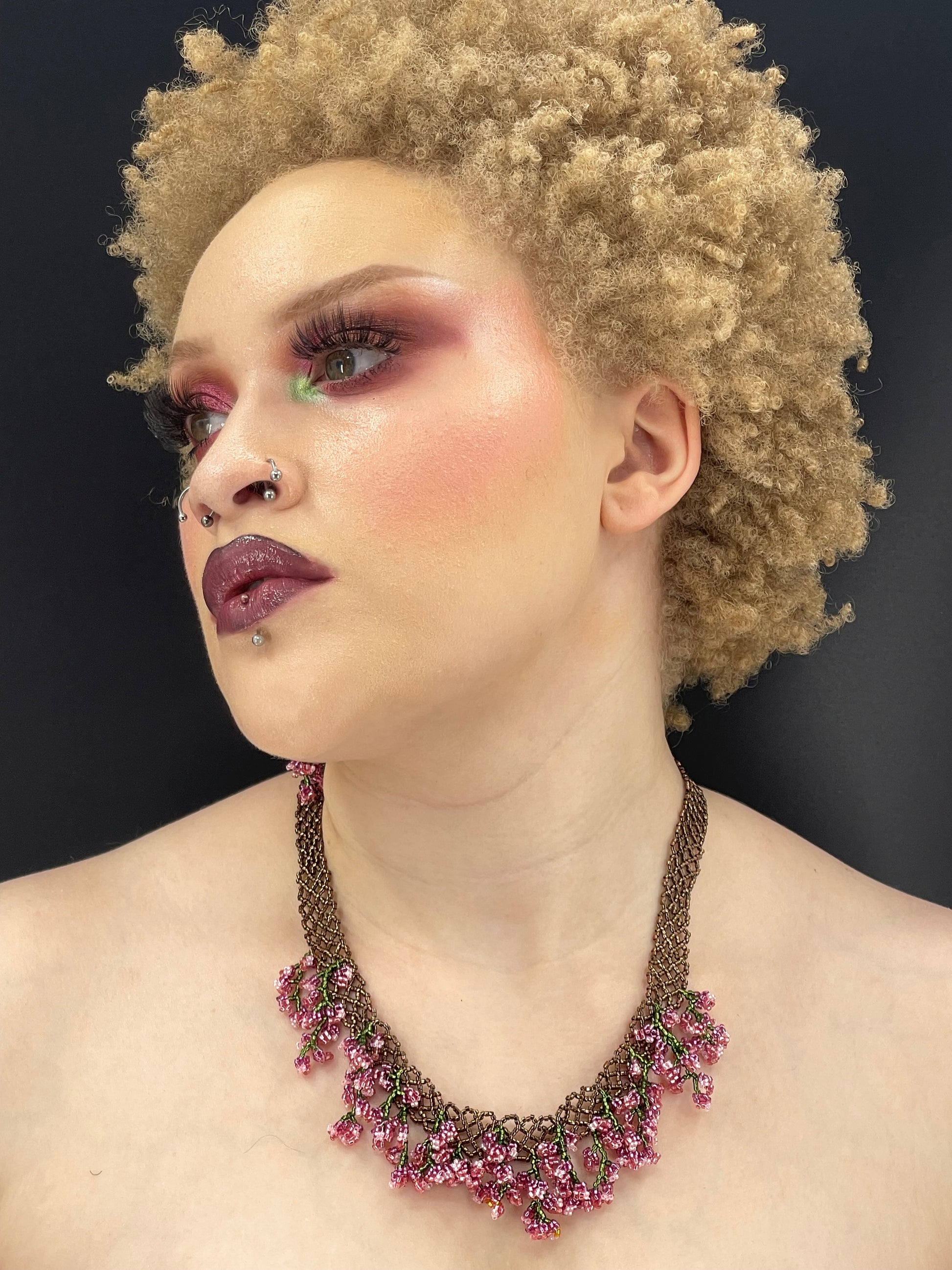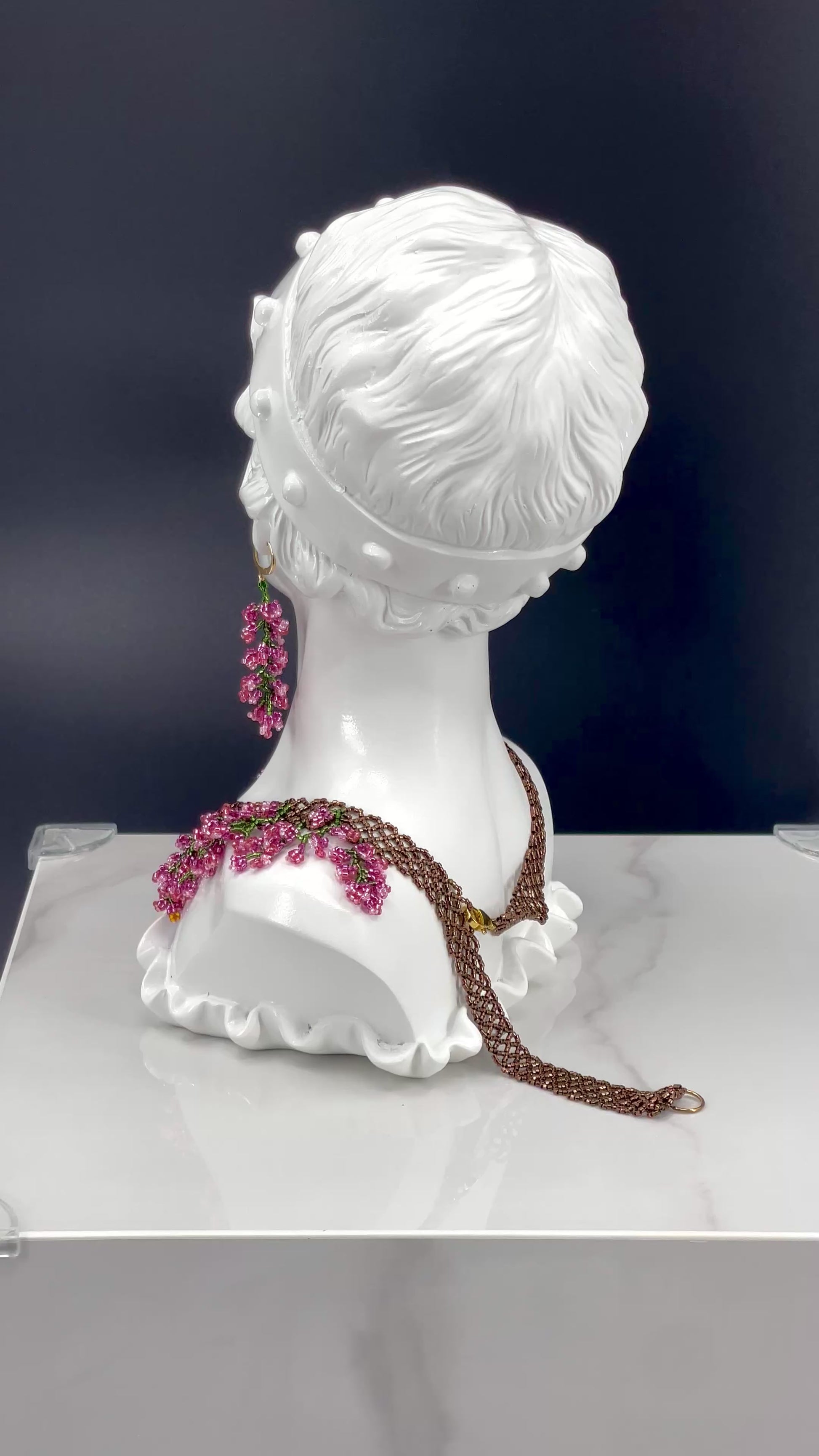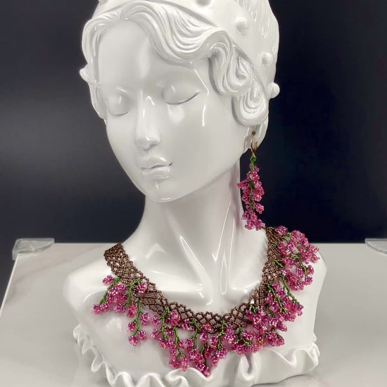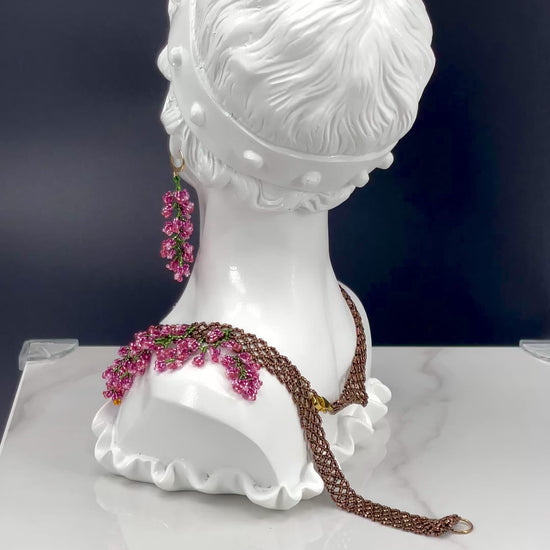 The Bella’s Bordeoux Set is a one-of-a-kind handwoven necklace and earring set featuring hundreds of branch components sculpted with over 5,000 beads. Each bead was individually sewn to create dazzling, juicy, berry appearance and texture.